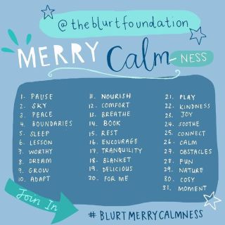 But for nowwww… the photo a day challenge! (Please imagine the nowwww as being really dramatic, thank you and panto-like). It’s called #blurtmerrycalmness and their aim is to “add some calm to the festive fuss”. They provide a prompt each day and you simply post the picture matching the prompt and you’re well away. I think this is a really good idea because although I love Christmas and seem to turn into a full-blown elf, I know that for a lot of people it isn’t a merry time of the year and you really don’t know how someone is feeling or if there is a particular reason they don’t enjoy this time of the year. I, personally, encourage you to be that little bit kinder to everyone you see (it’s a good habit to get into) and it might just make someone’s day. I will add the picture of prompts and you can search “The Blurt Foundation” on Instagram to keep up with their posts as well!